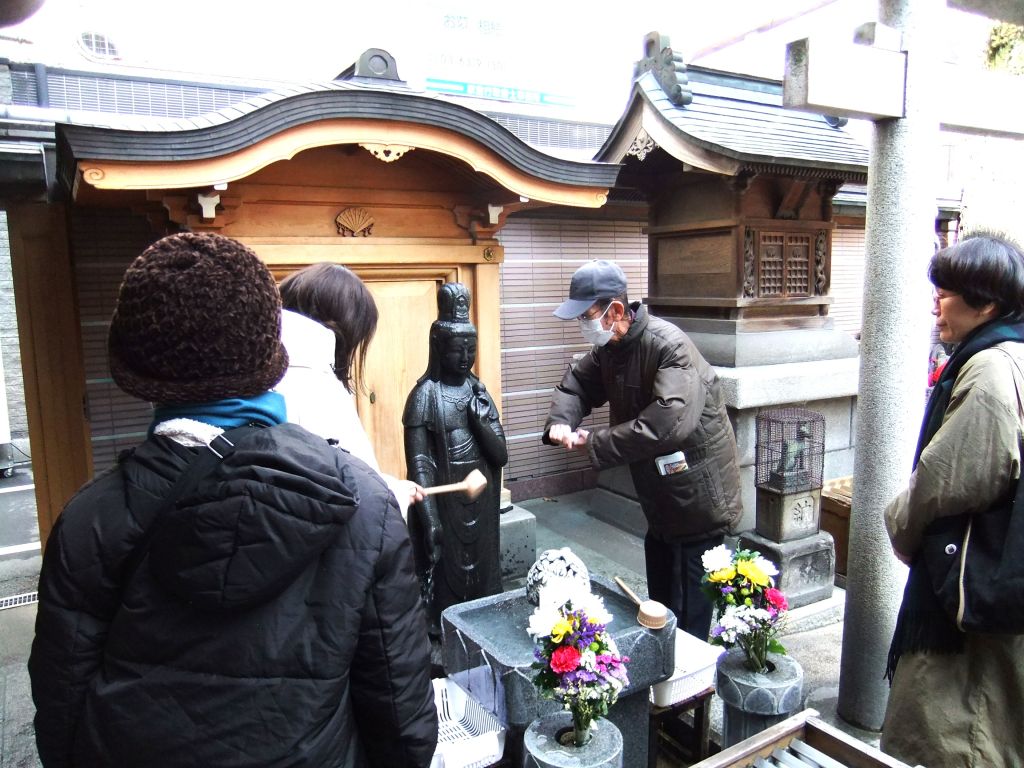 元祖塩大福みずのを横目に(おみやげは帰りにと)、とげぬき地蔵尊高岩寺(こうがんじ)に到着。数人が願いを込めて洗いました。ここで集合写真を、子持ちのお姉さんにシャッターを押していただいた。
