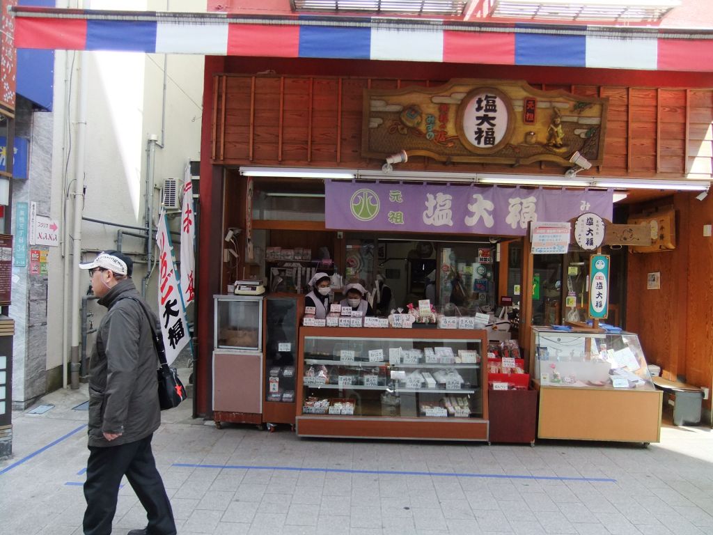 続いて、磯揚げまる天で晩酌のあてにと購入したら、先に歩いていた人が戻って買い求めていました。その他にもお茶・小魚の干物など目移りするものばかりです。帰り際に塩大福をお土産に、ほとんどの人が購入し散策を終えました。