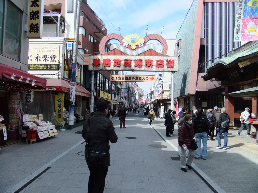 早速、散策の開始です。商店街の入り口に有る眞性寺(しんしょうじ)へと、赤・白の梅がとても素晴らしかったです。また、大きな傘をかぶり、杖を持つお地蔵様が江戸の六街道の出入り口に置かれ旅の安全を見守ってくれました。とげぬき地蔵と勘違いする人もいるとか?